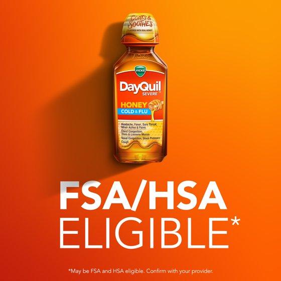 - NON-DROWSY DAYTIME COLD & FLU RELIEF. DayQuil SEVERE Honey formula is flavored with real honey and temporarily relieves common cold & flu symptoms so you can power through your day