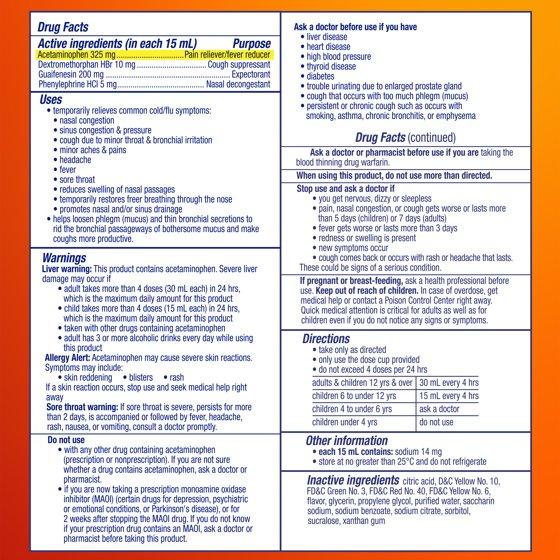 In Each 15 mL: Acetaminophen 325 mg Dextromethorphan HBr 10 mg Guaifenesin 200 mg Phenylephrine HCl 5 mg