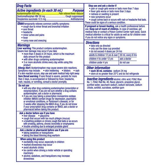 In Each 30 mL: Active Ingredients: Acetaminophen (650 mg), Pain Reliever/Fever Reducer; Dextromethorphan HBr (30 mg), Cough Suppressant; Doxylamine Succinate (12.5 mg), Antihistamine. Inactive Ingredients: Alcohol, Citric Acid., FD&C Blue No. 1, FD&C Red No. 40, Flavor, Glycerin, Propylene Glycol, Purified Water, Saccharin Sodium, Sodium Benzoate, Sodium Citrate, Sorbitol, Sucralose, Xanthan Gum.