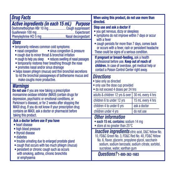 (in Each 15 mL) Active Ingredients: Dextromethorphan HBr (10 mg), Cough suppressant; Doxylamine Succinate (6.25 mg), Antihistamine; Phenylephrine HCI (5 mg), Nasal decongestant. Inactive Ingredients: Citric Acid, D&C Yellow No. 10, FD&C Green No. 3, FD&C Red No. 40, FD&C Yellow No.6, Flavor, Glycerin, Propylene Glycol, Saccharin Sodium, Sodium Benzoate, Sodium Citrate, Sorbitol, Sucralose, Water, Xanthan Gum.
