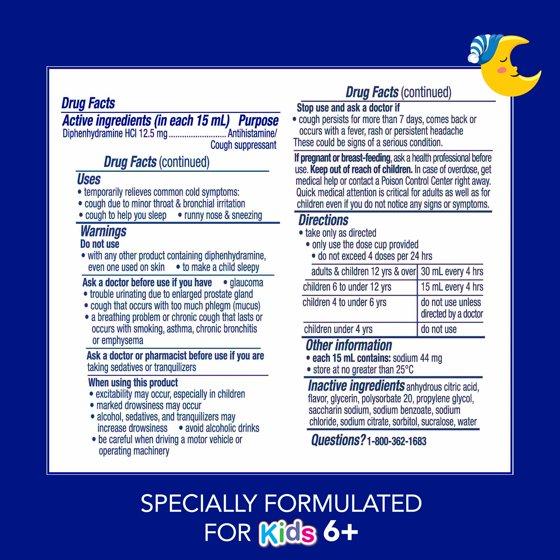 Active ingredients (in each 15 mL): Diphenhydramine HCl 12.5 mg Inactive ingredients: Anhydrous Citric Acid, Flavor, Glycerin, Polysorbate 20, Propylene Glycol, Saccharin Sodium, Sodium Benzoate, Sodium Chloride, Sodium Citrate, Sorbitol, Sucralose, Water