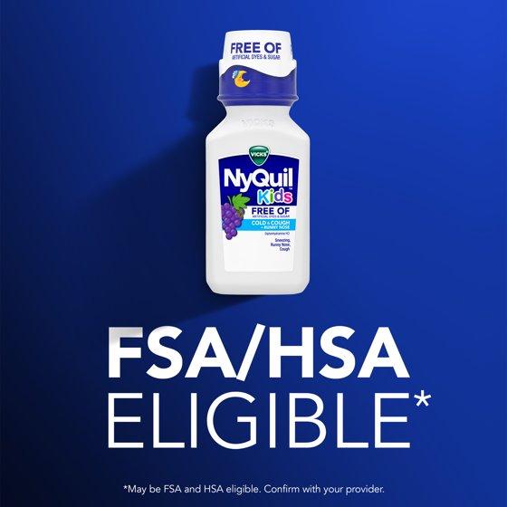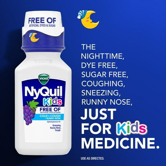 Vicks NyQuil Kids Free Of Cold & Cough multi-symptom relief liquid treats your child's cough, runny nose, and sneezing. It's formulated for children ages 6+ and designed for parents who want to give the best to their children, while avoiding artificial dyes, sugar, and high fructose corn syrup, and alcohol. NyQuil Kids Free Of Cold & Cough over-the-counter medicine contains proven ingredients to tackle your child's cold and cough symptoms, and is free of artificial dyes and sugar. Offering simple, effective relief, NyQuil Kids Free Of Cold & Cough Nighttime medicine relieves your child's symptoms so they, and the whole family, can get a good night's sleep. It is specially formulated for kids with a great-tasting grape flavor. Vicks has been trusted by parents to treat their children's cough, cold and flu symptoms for over 125 years.