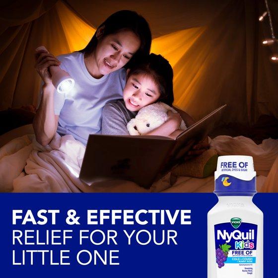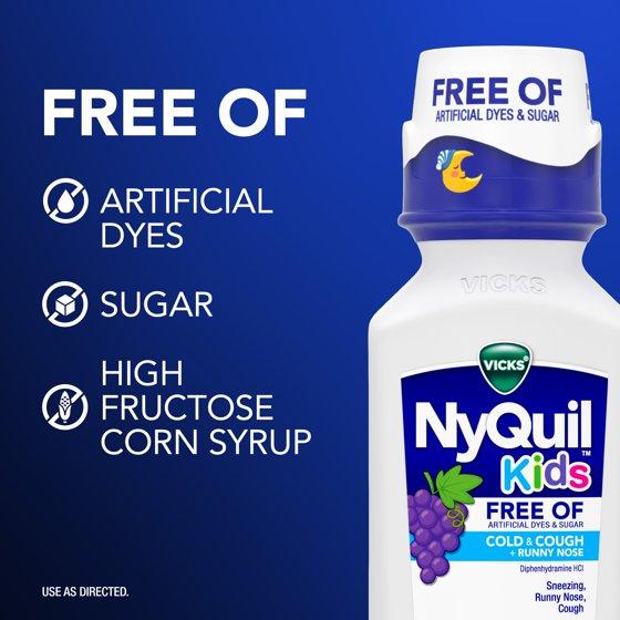 Vicks NyQuil Kids Free Of Cold & Cough multi-symptom relief liquid treats your child's cough, runny nose, and sneezing. It's formulated for children ages 6+ and designed for parents who want to give the best to their children, while avoiding artificial dyes, sugar, and high fructose corn syrup, and alcohol. NyQuil Kids Free Of Cold & Cough over-the-counter medicine contains proven ingredients to tackle your child's cold and cough symptoms, and is free of artificial dyes and sugar. Offering simple, effective relief, NyQuil Kids Free Of Cold & Cough Nighttime medicine relieves your child's symptoms so they, and the whole family, can get a good night's sleep. It is specially formulated for kids with a great-tasting grape flavor. Vicks has been trusted by parents to treat their children's cough, cold and flu symptoms for over 125 years.