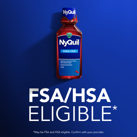 From the world's #1 selling OTC cough and cold brand, Vicks NyQuil Cold & Flu Liquid provides fast, powerful relief for your worst cold and flu symptoms. Get the NyQuil you trust in a great-tasting Cherry flavor. When cold symptoms keep you up, turn to Vicks NyQuil Cold & Flu nighttime relief over-the-counter medicine to help you get the rest you need. When you need fast relief, this powerful, multi-symptom relief medicine treats headache, fever, sore throat, minor aches and pains, sneezing, runny nose, and cough due to minor throat and bronchial irritation. Nothing works faster. Vicks has been trusted for over 125 years to relieve your cold and flu symptoms. Vicks NyQuil is the #1 pharmacist recommended nighttime cough, cold & flu brand*Active ingredients per 30 mL dose for adults are acetaminophen 650 mg (pain reliever/fever reducer), dextromethorphan HBr 30 mg (cough suppressant), and doxylamine succinate 12.5 mg (antihistamine). Store at room temperature; do not refrigerate. Take only as directed. Use only the dose cup provided. Do not exceed 4 doses per 24 hours. Adults and children 12 years and over take 30 mL every 6 hours.*2022 Pharmacy Times Survey of Pharmacists OTC Recommendations Nicholas Hall's global CHC sales database, DB23