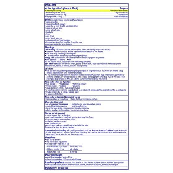 (in each 30 mL) Active Ingredients: Acetaminophen (650 mg), Pain Reliever/Fever Reducer; Dextromethorphan HBr (20 mg), Cough Suppressant; Doxylamine Succinate (12.5 mg), Antihistamine; Phenylephrine HCl (10 mg), Nasal Decongestant. Inactive Ingredients: Citric Acid, FD&C Blue No. 1, FD&C Red No. 40, Flavor, Glycerin, Propylene Glycol, Purified Water, Saccharin Sodium, Sodium Benzoate, Sodium Chloride, Sodium Citrate, Sorbitol, Sucralose, Xanthan Gum.
