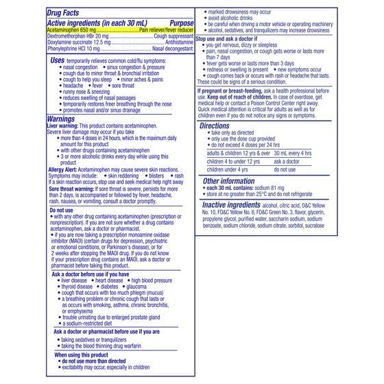 Active Ingredients: Acetaminophen 650 mg, Dextromethorphan HBr 20 mg, Doxylamine Succinate 12.5 mg, Phenylephrine HCl 10 mg Inactive Ingredients: Alcohol, Citric Acid, D&C Yellow No. 10, FD&C Yellow No. 6, FD&C Green No. 3, Flavor, Glycerin, Propylene Glycol, Purified Water, Saccharin Sodium, Sodium Benzoate, Sodium Chloride, Sodium Citrate, Sorbitol, Sucralose