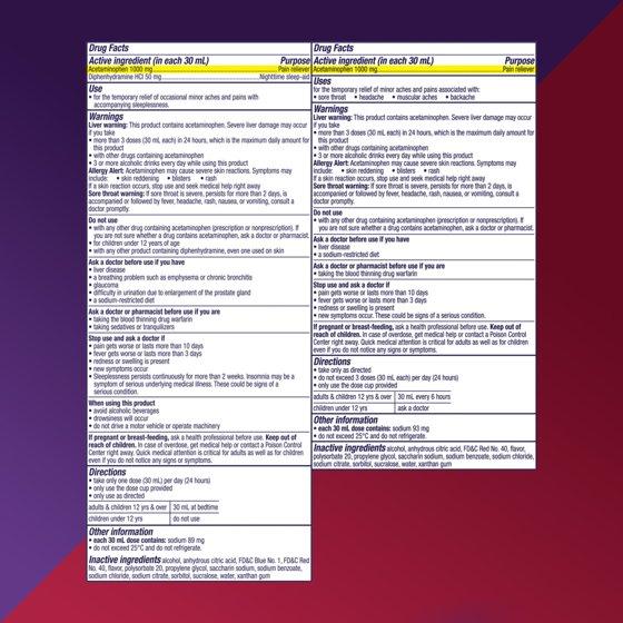In Each 30 mL: Active Ingredients: Acetaminophen (1000 mg), Pain Reliever; Diphenhydramine HCI (50 mg), Nighttime Sleep-Aid. Inactive Ingredients: Alcohol, Anhydrous Citric Acid, FD&C Blue 1, FD&C Red 40, Flavor, Polysorbate 20, Propylene Glycol, Saccharin Sodium, Sodium Benzoate, Sodium Chloride, Sodium Citrate, Sorbitol, Sucralose, Water, Xanthan Gum. In Each 30 mL: Active Ingredients: Acetaminophen (1000 mg), Pain Reliever. Inactive Ingredients: Alcohol, Anhydrous Citric Acid, FD&C Red 40, Flavor, Polysorbate 20, Propylene Glycol, Saccharin Sodium, Sodium Benzoate, Sodium Chloride, Sodium Citrate, Sorbitol, Sucralose, Water, Xanthan Gum. In Each 30 mL: Active Ingredients: Acetaminophen (1000 mg), Pain Reliever; Diphenhydramine HCI (50 mg), Nighttime Sleep-Aid. Inactive Ingredients: Alcohol, Anhydrous Citric Acid, FD&C Blue 1, FD&C Red 40, Flavor, Polysorbate 20, Propylene Glycol, Saccharin Sodium, Sodium Benzoate, Sodium Chloride, Sodium Citrate, Sorbitol, Sucralose, Water, Xanthan Gum. In Each 30 mL: Active Ingredients: Acetaminophen (1000 mg), Pain Reliever. Inactive Ingredients: Alcohol, Anhydrous Citric Acid, FD&C Red 40, Flavor, Polysorbate 20, Propylene Glycol, Saccharin Sodium, Sodium Benzoate, Sodium Chloride, Sodium Citrate, Sorbitol, Sucralose, Water, Xanthan Gum.