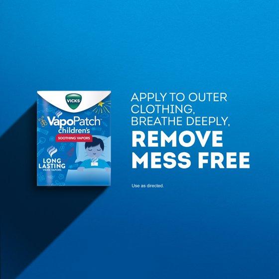 Vicks Children's VapoPatch wearable aroma patches provide soothing, non-medicated Vicks vapors in an easy-to-use patch. Instead of dealing with messy ointments or creams, these wearable aroma patches can be worn directly on your child's clothes. Experience the Vicks vapor scent you know and love with no greasy or messy creams or ointments. Soothe your child's senses with Vicks Children's VapoPatch. Each wearable patch contains a blend of eucalyptus and essential oils + the scents of menthol and camphor. Simply peel, apply to the outside of your child's shirt or other article of clothing, and experience the soothing, non-medicated vapors. Each VapoPatch is long-lasting and can be worn up to 8 hours. Children's VapoPatch can be worn during the day or overnight while sleeping. Children's VapoPatch can be used by children ages 6 and older. Use only one patch at a time. Do not apply to skin.
