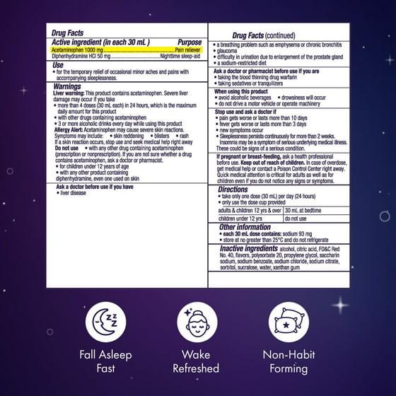 Active Ingredients: In each 30 mL: Acetaminophen 1000 mg (Pain Reliever), Diphenhydramine HCl 50 mg (Nighttime Sleep-aid) Inactive Ingredients: Alcohol, Citric Acid, FD&C Red No, 40, Flavors, Polysorbate 20, Propylene Glycol, Saccharin Sodium, Sodium Benzoate, Sodium Chloride, Sodium Citrate, Sorbitol, Sucralose, Water, Xanthan Gum
