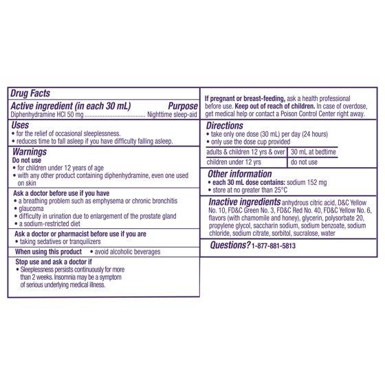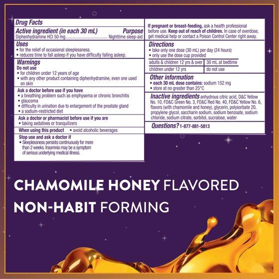 Active Ingredient: In each 30 mL: Diphenhydramine HCl 50 mgInactive Ingredients: Anhydrous Citric Acid, D&C Yellow No. 10, FD&C Green No. 3, FD&C Red No. 40, FD&C Yellow No. 6, Flavors (With Chamomile And Honey), Glycerin, Polysorbate 20, Propylene Glycol, Saccharin Sodium, Sodium Benzoate, Sodium Chloride, Sodium Citrate, Sorbitol, Sucralose, Water