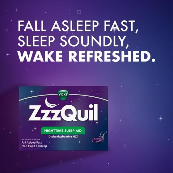 When you're having trouble getting that sound sleep your body craves, add some Zzzs to your night with ZzzQuil nighttime sleep aid . ZzzQuil nighttime sleep aid liquid capsules work to help you fall asleep fast - in as little as 20 minutes - so you can get the sleep when you need it and wake refreshed. All ZzzQuil nighttime sleep aid products are non-habit forming and specifically formulated with clinically proven ingredients by our team of dedicated scientists. ZzzQuil nighttime sleep aids contain a non-habit-forming ingredient, Diphenhydramine HCI, which causes drowsiness by blocking the action of histamine, a chemical that sends waking signals to the brain. Each dose (2 LiquiCaps) contains 50mg. It helps you get some shut-eye, so you can wake up feeling refreshed and ready to take on your day. These fast acting^ liquid capsules can be used to treat occasional sleeplessness when you need a little extra sleep support. ZzzQuil is the World's #1 Sleep Aid Brand! Explore ZzzQuil's range of products to help you fall asleep, including our line of ZzzQuil PURE Zzzs Melatonin products. Source Euromonitor International Limited; Consumer Health 2022 Edition; Sleep Aids, all channels, retail selling price, Global Brand Name ZzzQuil 2021 data^vs. placebo. * LiquidCaps