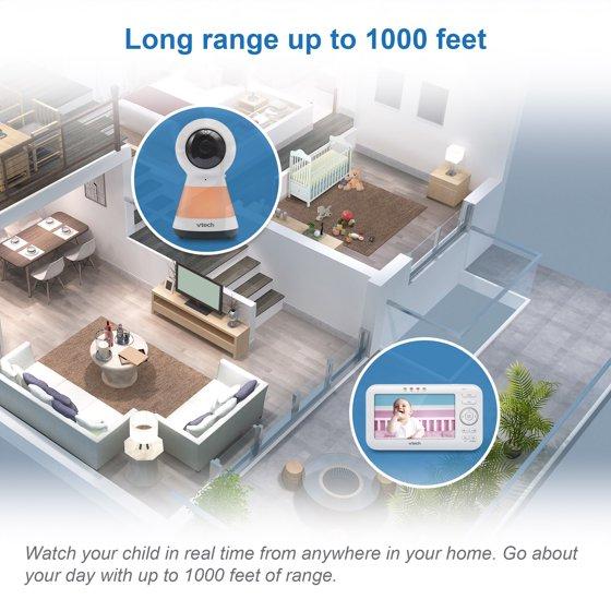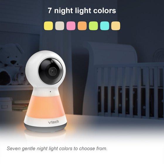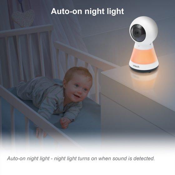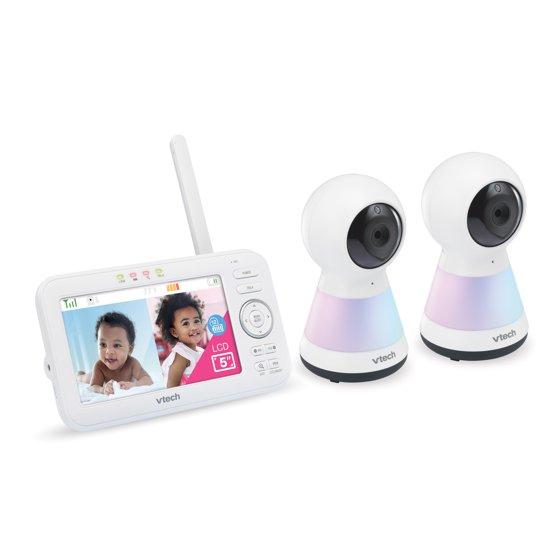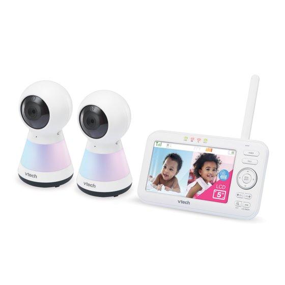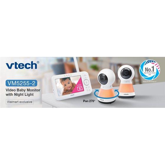Check in on your little one with a large, 5-inch LCD screen on the VTech 2 Camera VM5255-2 Digital Video Pan Scan Baby Monitor with Adaptive Night Light. This video monitor lets you pan scan right and left to get a better look in the nursery using the long-range parent unit display. Soothe your baby using the adaptive multi-color night light that adjusts to the lighting of the nursery and lullabies and soft sounds that play right from the baby unit. Plus, you can make sure your infant is cozy by monitoring the nursery temperature that's displayed right on the large 5" LCD screen. Best of all, you can check in during nap time or after dark thanks to automatic infrared night vision. • High-resolution, 5-inch color LCD screen - Clearly see every little move right from the parent unit. When you check in on your baby, you'll feel like you've never left the nursery. • Pan and Zoom - Watch as your little one moves about. The camera pans up to 270 degrees side-to-side. Need more detail? The camera even zooms up to 1.33 times. • Adaptive night light on baby unit - A soothing light on the baby unit gently illuminates a dark nursery. This adaptive night light automatically adjusts to the brightness of your nursery to ensure for optimum light in day or night settings that creates the best sleeping environment. Choose from seven different colors. • Soothing sounds and lullabies - Five calming melodies and four soft ambient sounds, including a trickling stream and white noise, help your baby slip into a sweet slumber. • Two-way, talk-back intercom - Sometimes all your baby needs is to hear the sound of your voice. Comfort your infant from any room with the built-in intercom on the portable parent unit. • Temperature sensor - Keep your little one cozy. The temperature indicator on the parent unit lets you know when it's time to adjust the thermostat. • Adjustable camera angle - The camera is easy to adjust, so you can have the best view no matter where you place the baby unit.