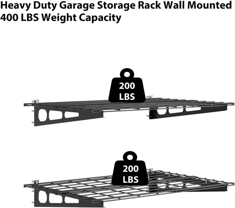 - Robust and Long-Lasting Build--Constructed from metal steel with a sandblasted finish, these wall-mounted garage shelves deliver outstanding durability and strength. The reinforced hook design firmly secures the brackets, preventing bending or detachment, allowing you to safely store heavy items up to 800 lbs.