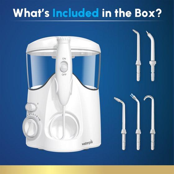 - MODEL: Waterpik Ultra WF-100 White, countertop electric water flosser oral irrigator with 5 color-coded flossing tips for multiple family members and dental needs