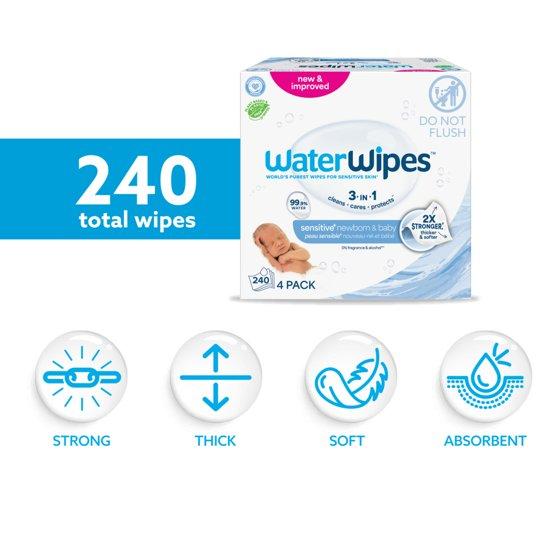WaterWipes Sensitive Newborn & Baby Wipes, 3-In-1 Cleans, Cares, Protects, 99.9% Water, Unscented & Hypoallergenic, 4 Packs (240 Wipes)