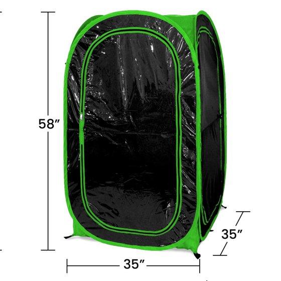 SPECS –– Dimensions: 35” (D) X 35” (W) X 58” (H) ... Floor Space: 8.51 ft² (35” X 35”) ... Weight: 6.6 lbs. ... Folded Diameter: 20" ... Seating Capacity: 1 ... Protects Against: Precipitation, Cold ... Doors: 3 ... Windows: 0 ... View Panels: 3 ... Carry Case and Ground Stakes included ... View Panel Material: Tinted, Cold-Treated PVC Plastic ... Fabric Material (Roof and Trim): Oxford 210 polyester with UPF 50 Sun Protection ... Zippered Back Vent: Yes.