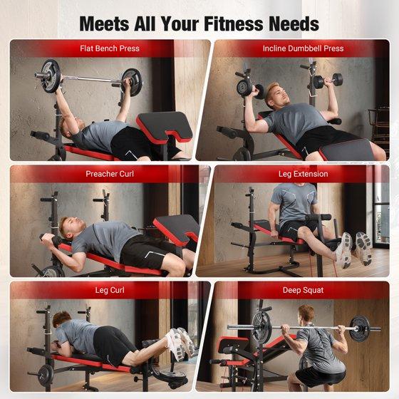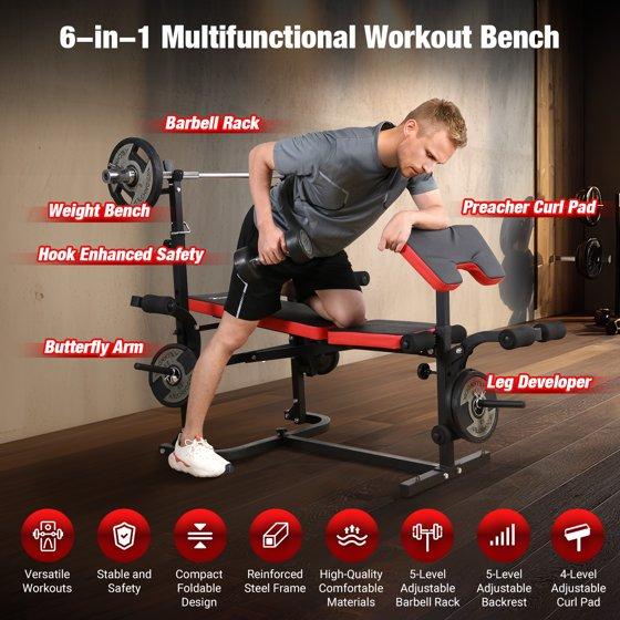 - The 6-in-1 design supports various exercises including leg extension, bench press, sit-ups, preacher curl, chest expansion, and deep squat.