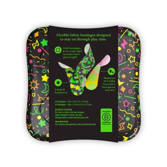 Ready, set, glow! Light up the night with these glow-in-the-dark flex fabric bandages. They’re a perfect blend of throwback neon charm and exciting innovation, ready for any party zone adventure. Hold the bandages (and tin lid!) under a light to make them glow extra bright. These trendy designs stay put through playtime, party time, or bedtime, making every night a glowing celebration. Welly is for everyone that was afraid to fall down, fail, get bumped, get scratched and did it anyway. Welly is for the wellness in all of us, however that looks, and for being prepared for whatever comes our way. We wear our bandages like badges of honor for a life fully lived. Our portable first aid kits are packed with essentials, so you have what you need, when you need it. And our signature Welly tins can be reused again and again—the possibilities are endless. Ready to glow? Power up your bandages with the sun or a quick LED charge. 1.Place bandages in the sun or uv light for a supercharged glow (the longer the brighter!) 2.No sun? No problem! Shine a bright LED light on your bandages for a quick 2 minute charge. Just get them 3" away for the best glow show! (We do not recommend using a phone flashlight.) 3.Once charged, find a dark place and watch the magic happen! Your bandages are ready to glow