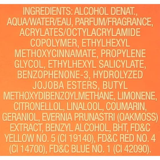 Alcohol Denat., Aqua/Water/Eau, Parfum/Fragrance, Acrylates/Octylacrylamide Copolymer, Ethylhexyl Methoxycinnamate, Propylene Glycol, Ethylhexyl Salicylate, Benzophenone-3, Hydrolyzed Jojoba Esters, Butyl Methoxydibenzoylmethane, Limonene, Citronellol, Linalool, Coumarin, Geraniol, Evernia Prunastri (Oakmoss) Extract, Benzyl Alcohol, BHT, FD&C Yellow 5 (CI 19140), FD&C Red 4 (CI 14700), FD&C Blue 1 (CI 42090).