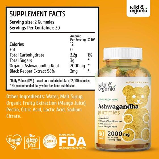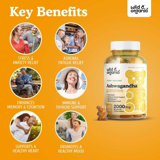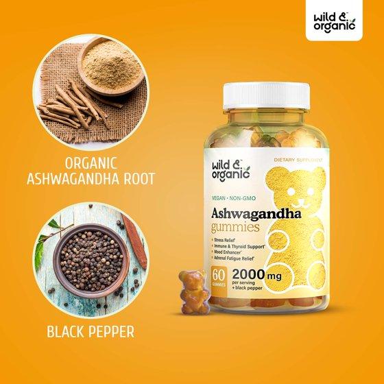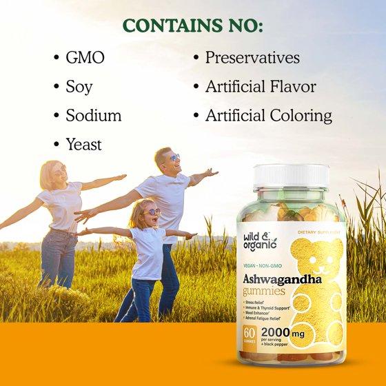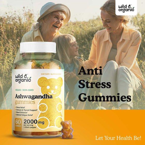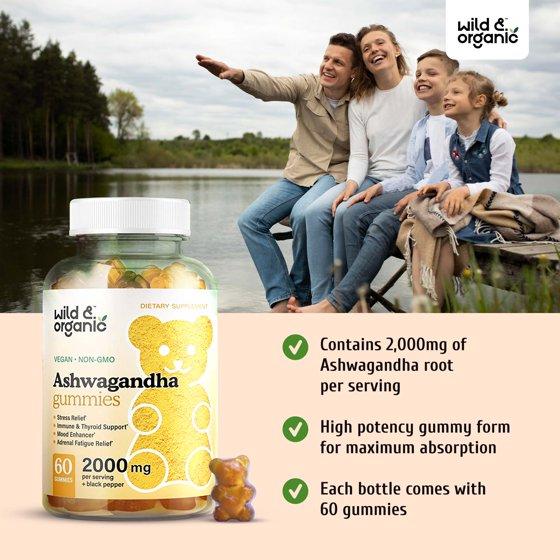 Wild & Organic Ashwagandha Gummies - Stress Relief Gummy - Mood & Immune Support, 60 Chews