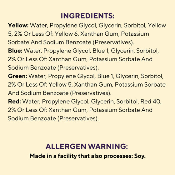 Yellow: Water, Propylene Glycol, Glycerin, Sorbitol, Yellow 5, 2% Or Less Of: Yellow 6, Xanthan Gum, Potassium Sorbate And Sodium Benzoate (Preservatives). Blue: Water, Propylene Glycol, Blue 1, Glycerin, Sorbitol, 2% Or Less Of: Xanthan Gum, Potassium Sorbate And Sodium Benzoate (Preservatives). Green: Water, Propylene Glycol, Blue 1, Glycerin, Sorbitol, 2% Or Less Of: Yellow 5, Xanthan Gum, Potassium Sorbate And Sodium Benzoate (Preservatives). Red: Water, Propylene Glycol, Glycerin, Sorbitol, Red 40, 2% Or Less Of: Xanthan Gum, Potassium Sorbate And Sodium Benzoate (Preservatives).