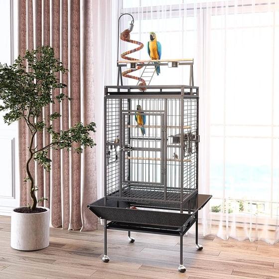 Simple and stylish cage with a large space suitable for accommodating several birds. It's the ideal size for Lovebirds, Cockatiels, Parakeets, and other medium-sized birds. Sturdy and durable enough to handle your birds' bites and harsh weather conditions.Non-toxic material to keep your lovely birds safe. Your feathery friends will have a comfortable and healthy way of life with this spacious 82‘’ bird cage.The bird cage with stand is ultra-strong, durable and safe for your birds, with easy cleaning features, pull-out plastic waste tray, accessible feed dispensers, and lockable feed doors. The portable rolling stand allows you to move it around the room easily, and the birdcage's open design promotes intimacy with your birds.