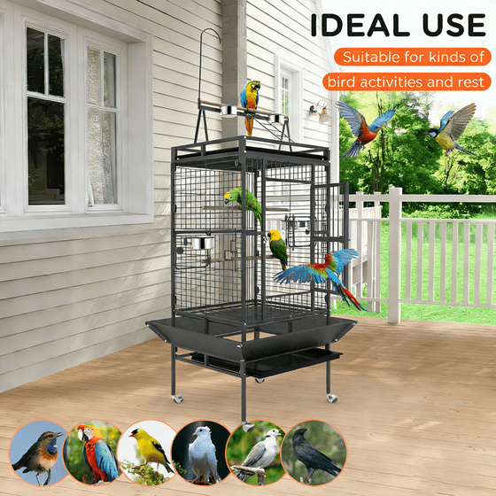 Simple and stylish cage with a large space suitable for accommodating several birds. It's the ideal size for Lovebirds, Cockatiels, Parakeets, and other medium-sized birds. Sturdy and durable enough to handle your birds' bites and harsh weather conditions.Non-toxic material to keep your lovely birds safe. Your feathery friends will have a comfortable and healthy way of life with this spacious 82‘’ bird cage.The bird cage with stand is ultra-strong, durable and safe for your birds, with easy cleaning features, pull-out plastic waste tray, accessible feed dispensers, and lockable feed doors. The portable rolling stand allows you to move it around the room easily, and the birdcage's open design promotes intimacy with your birds.