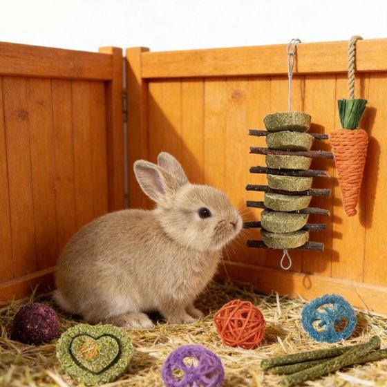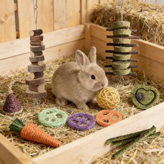 【WIDE USES 】These bunny chew toys can be hang in the cages with hooks,fit for rabbits,bunny, hamsters, guinea pigs, squirrel, rabbits,chinchillas, parrot,, providing more fun for your pets.
