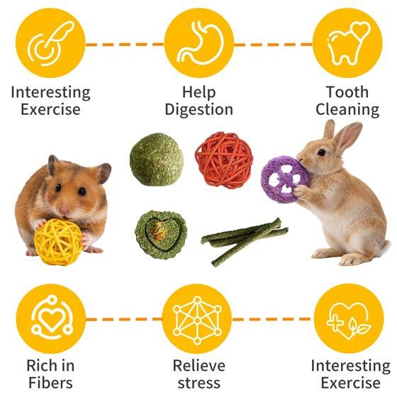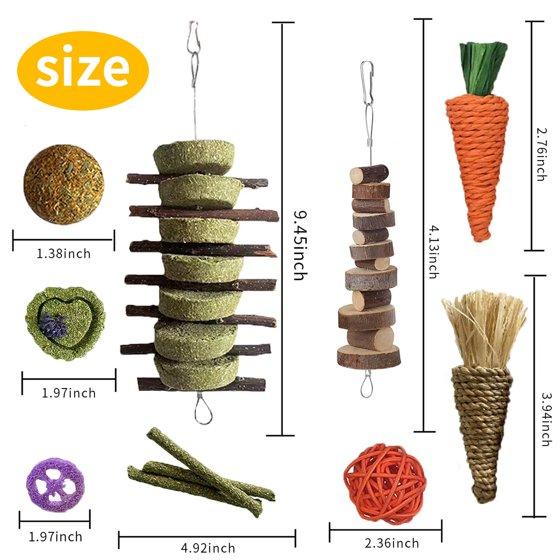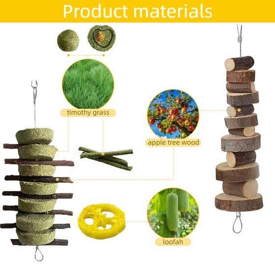【NATURAL MATERIAL 】 All toys are made of natural materials such as apple wood, loofah,timothy grass,wood vines,very safe for your lovely pets to play and chew. there materials are not only rich in fibers can clean your pet’s tooth,promote digestion,but also excellent toys for exercising and relieving stress