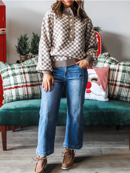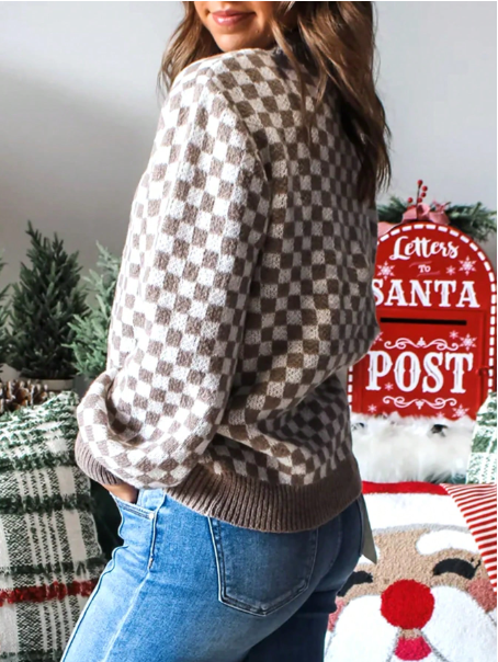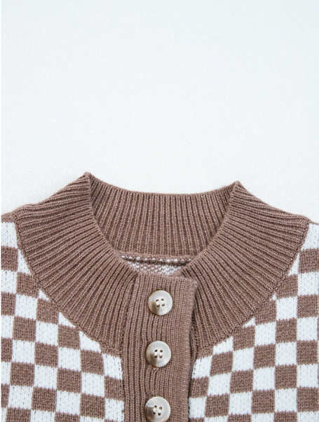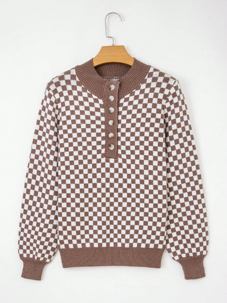 Women's Brown Checkerboard Pattern Contrasting Patchwork Ribbed Half Open Button Up Stand Up Collar Loose Sweater