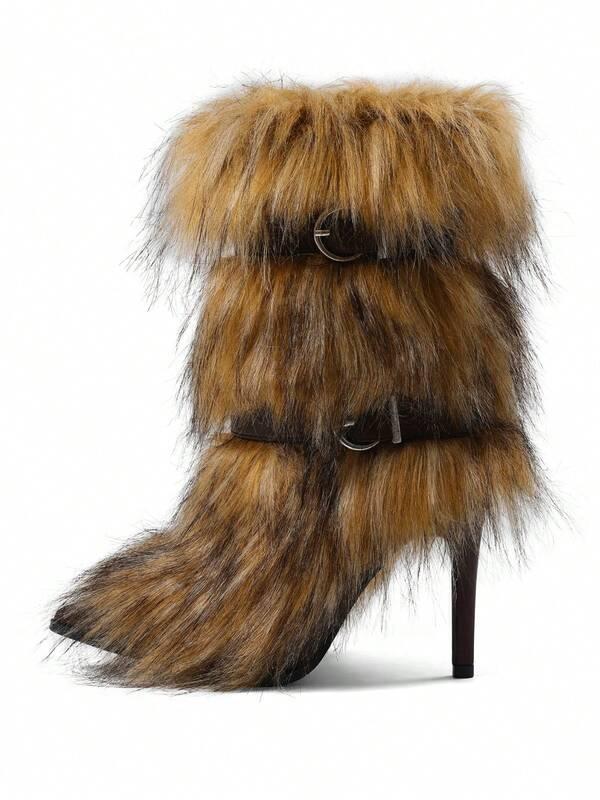 Women's Knee High Boots Point Toe Slip On Boots Sexy Stiletto High Heel Furry Boots Warm Straight Long Belt Straps Decorative Fashion Boots