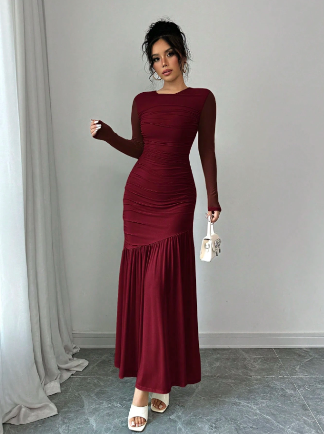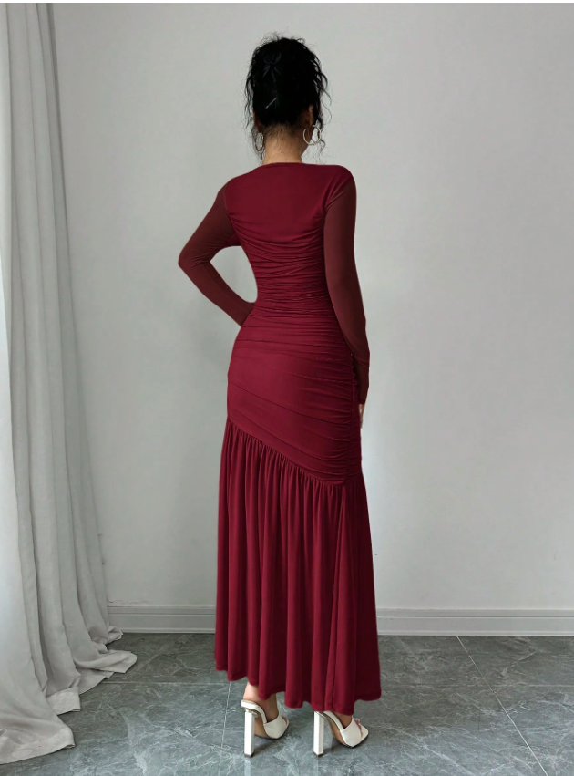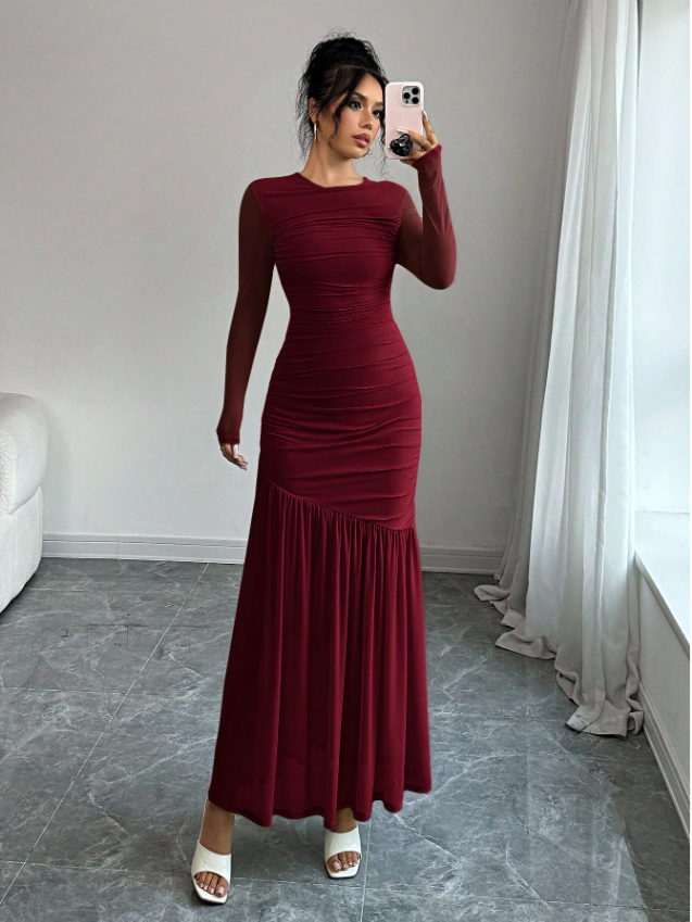 Women's Long Sleeve Round Neck Mesh Dress, Suitable For Autumn Seasonal Clothing, Back To School, Teacher's Attire