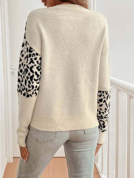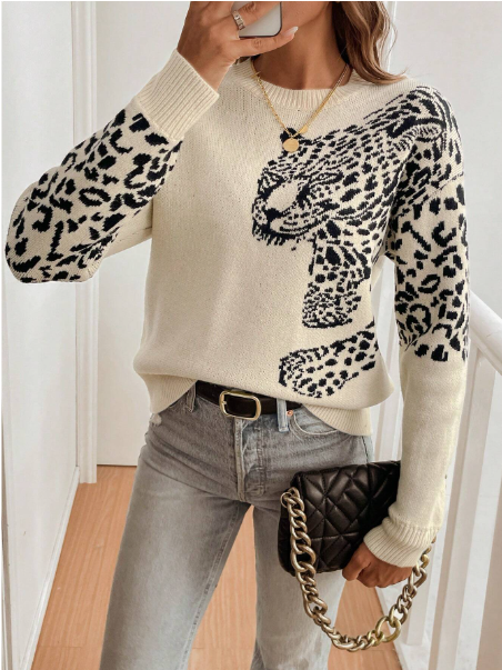 Women's Round Neck Leopard Print Long Sleeve Sweater,Long Sleeve Tops Knit Pullover Fall Winter Outfit