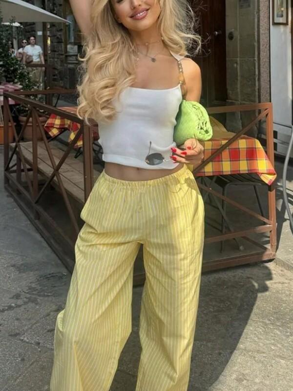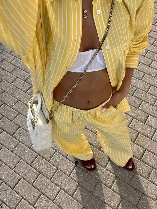 Women's Striped Drop Shoulder Long Sleeve Blouse And Wide Leg Pants Set, Casual Spring Summer Two-Piece Outfit