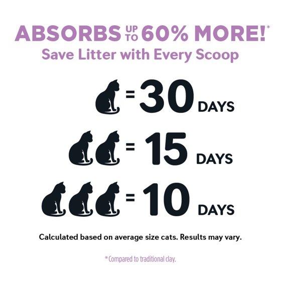 - Absorbs up to 60% more compared to traditional clay — skip the smells and extra cleanup with the super-absorbent corn litter that delivers a long-lasting clean - a single bag lasts 30 days*