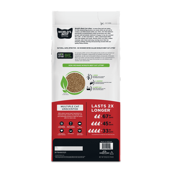 WORLD'S BEST CAT LITTER Multiple Cat Unscented - Natural Ingredients, Quick Clumping, Flushable, 99% Dust Free - Long-Lasting Odor Control & Easy Scooping - 28 lb Bag