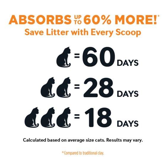 - Absorbs up to 60% more compared to traditional clay — skip the smells and extra cleanup with the super-absorbent corn litter that delivers a long-lasting clean — a single bag lasts 30 days*
