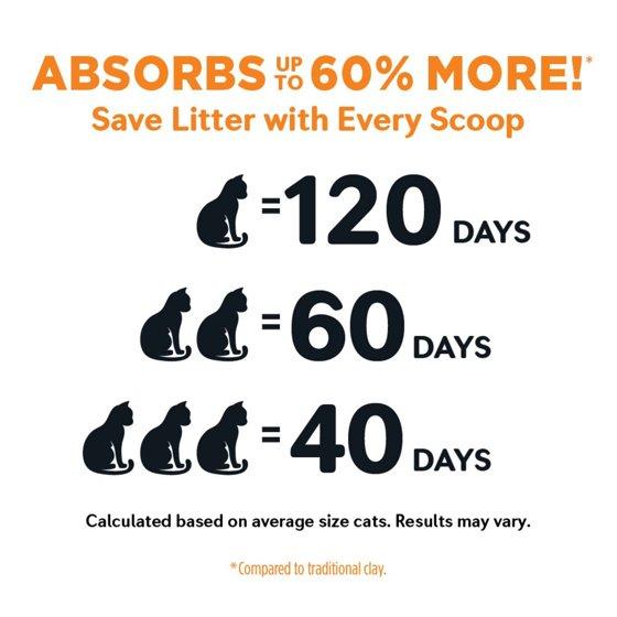 - Absorbs up to 60% more compared to traditional clay — skip the smells and extra cleanup with the super-absorbent corn litter that delivers a long-lasting clean — a single bag lasts 30 days*
