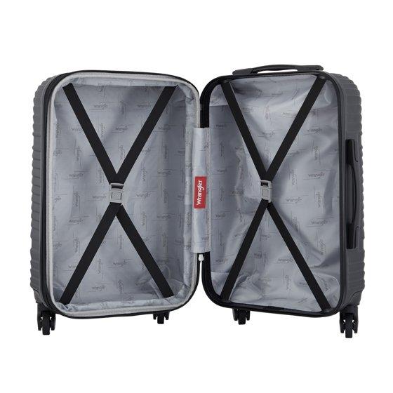Travel in riveting style with Wrangler's 4-piece Hardside Expandable Spinner Travel Set. Well-equipped, durable, and robust, this 4-piece set includes a 25” expandable checked suitcase, a 20” expandable rolling carry-on, and a 12” packing cube on top of a 15” larger packing cube to suit your organizational needs. The stylish hard-side exterior is designed with three rows of diagonal lines, invoking a sense of movement and action that embodies the most exciting and thrilling aspects of why we travel. The hard side is 100% ABS, a durable and flexible material that is made to absorb shocks and impacts on contact and ‘flex' back into its original shape. In addition, this set comes loaded with more quality features. The push-button telescopic handle with a contoured grip paired with the 360-degree multi-directional spinner wheels create a completely weightless and smooth rolling experience that relieves any pressure from your arms, especially if the suitcase is packed to the brim. The fully lined interior is spacious and comes with a divider panel to separate and organize your packing essentials. This feature can be further utilized with packing cubes to help compartmentalize your packing needs. Measured at 25” x 16.5” x 11” and 20” x 13.5” x 9”, The 20" in height is 22" and should meet most airline carry-on restrictions.