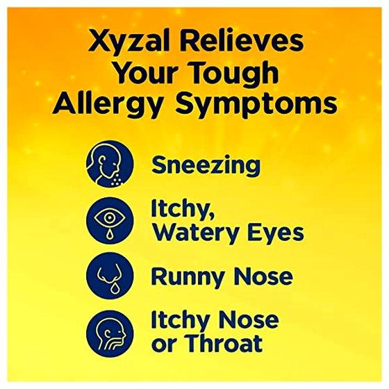 Levocetirizine Dihydrochloride 5 mg. Relieves Runny Nose, Sneezing, Itchy/Watery Eyes & Itching Nose or Throat 24 Hour Allergy Relief 2 Bottles, 55 Tablets Each Xyzal is a prescription strength allergy medicine that relieves symptoms of indoor and outdoor allergies, including sneezing; itchy, watery eyes; runny nose; itchy nose or throat. Find rapid relief with Xyzal, which starts working in one hour –– and it keeps working for 24 hours. Xyzal is taken at night before going to bed so you wake feeling refreshed and symptom-free in the morning when pollen is at its worst. Take at night for all-night and all-day relief 24 hours of relief from allergy symptoms Original prescription-strength formula Starts working in one hour Works for indoor and outdoor allergies Suggested Use: Adults 65 years of age and older: Ask a doctor Adults and children 12-64 years of age: Take 1 tablet (5 mg) once daily in the evening Do not take more than 1 tablet (5 mg) in 24 hours 1/2 tablet (2.5 mg) once daily in the evening may be appropriate for less severe symptoms Children 6-11 years of age: Take 1/2 tablet (2.5 mg) once daily in the evening Do not take more than 1/2 tablet (2.5 mg) in 24 hours Children under 6 years of age: Do not use Consumers with kidney disease: Do not use