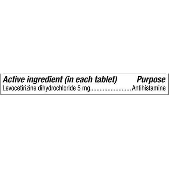Inactive Ingredients: Colloidal anhydrous silica, hypromellose, lactose monohydrate, magnesium stearate, microcrystalline cellulose, polyethylene glycol 400, titanium dioxide.Ingredients: Active Ingredients: In Each Tablet: Levocetirizine Dihydrochloride (5 mg). Purpose: Antihistamine. Inactive Ingredients: Colloidal Anhydrous Silica, Hypromellose, Lactose Monohydrate, Magnesium Stearate, Microcrystalline Cellulose, Polyethylene Glycol 400, Titanium Dioxide.Active Ingredients: Levocetirizine dihydrochloride 5 mgActive Ingredient Name: Cetirizine