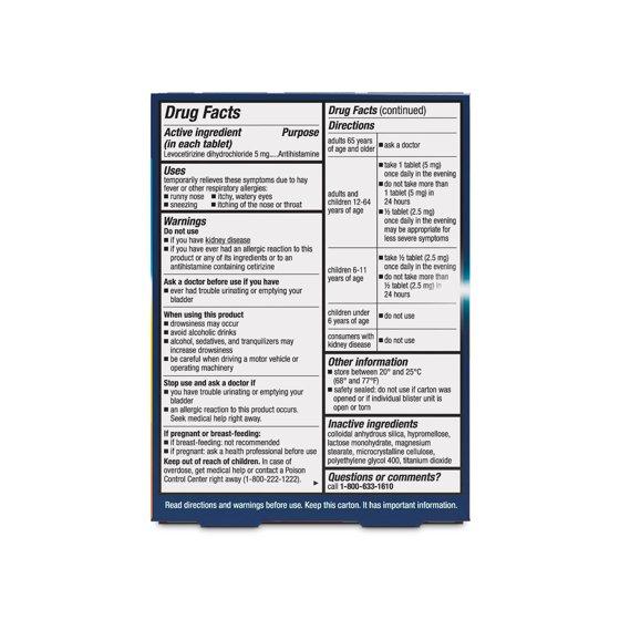 Active Ingredients: In Each Tablet: Levocetirizine Dihydrochloride (5 mg). Purpose: Antihistamine. Inactive Ingredients: Colloidal Anhydrous Silica, Hypromellose, Lactose Monohydrate, Magnesium Stearate, Microcrystalline Cellulose, Polyethylene Glycol 400, Titanium Dioxide.