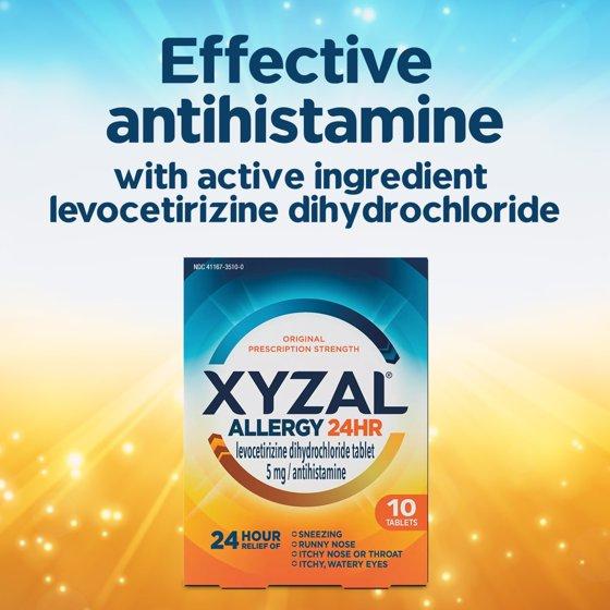 - CONTAINS: One (1) 10-count bottle of Xyzal 24 Hour Allergy Relief Medicine, Original Prescription Strength Antihistamine, Levocetirizine Dihydrochloride Tablets, 5 mg