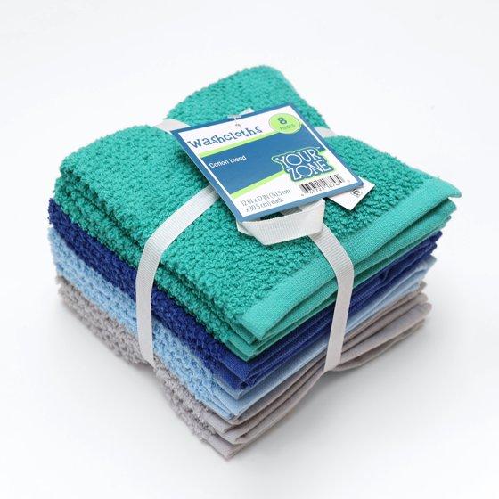 Your Zone 8 Pack Kids Wash Cloths Cotton Blended Fabric, Blue, Teal, and Gray