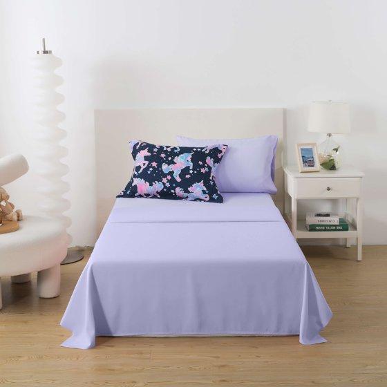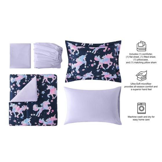 - STYLISH BEDDING DESIGN: The comforter is reversible with a fun colorful unicorns on one side and a solid purple on the other, comes with a solid purple sheet set for a complete look