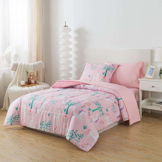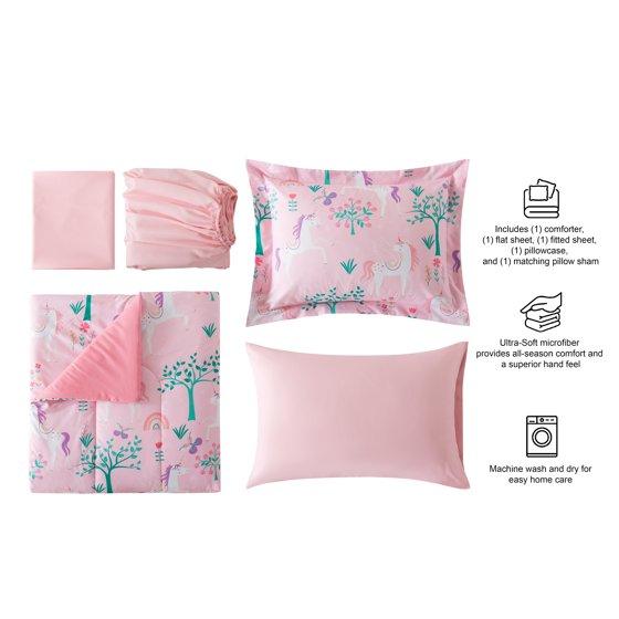 - STYLISH BEDDING DESIGN: The comforter is reversible with fun pink unicorns on one side and a solid pink on the other, comes with a solid pink sheet set for a complete look