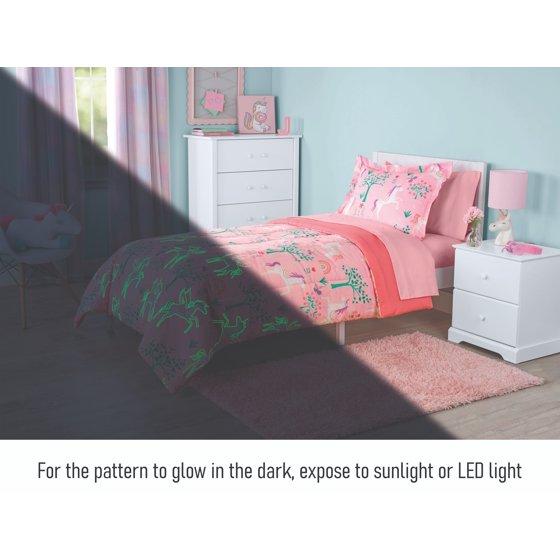 - Your Zone Glow in the Dark 5-Piece Pink Unicorn Bedding Set for Kids with Fabric Storage Bag, Twin