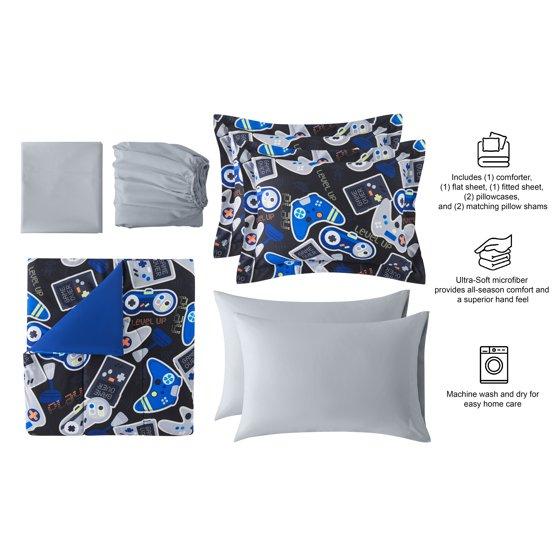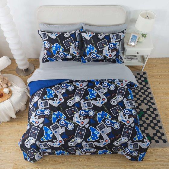 - FUN GAMER BEDDING DESIGN FOR KIDS: This trendy gaming bed-in-a-bag features colorful video game icons, controllers, and level-up graphics on one side, reversible to a solid blue back — the perfect kids’ gamer bedding set to upgrade any video game-themed bedroom