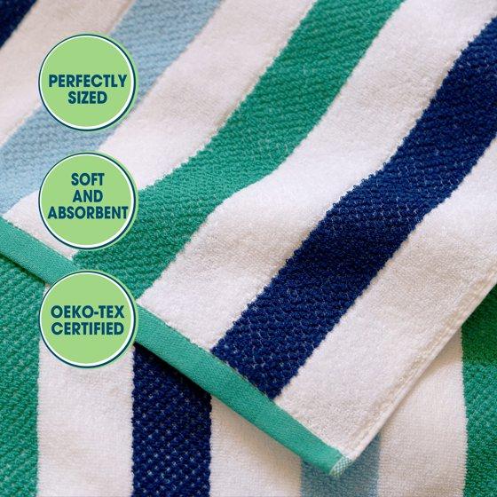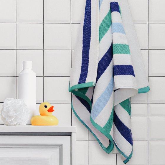 This fun bath towel adds style and utility to bath time. Featuring bold blue and green color stripes this cotton blend towel comes in at a generous size of 27 x 52 inches, ideal for drying off after bath time. With soft and absorbent terry cotton loops, this bath towel is suitable for both indoor and outdoor use. Machine washable for easy and convenient care. Walmart proudly partners with the Better Cotton Initiative (BCI), which promotes improvements to the working conditions and environmental impact of global cotton production. OEKO-TEX certified. OEKO-TEX is an independent testing and certification system for textile products that is recognized worldwide and guarantees that the curtain fabric was produced without the use of any harmful substances.