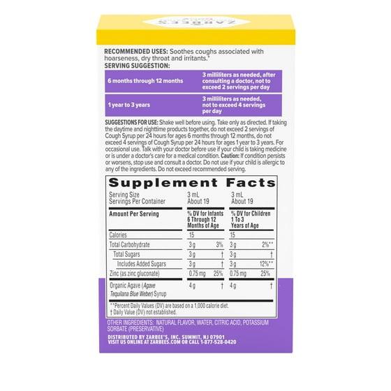 Supplement Facts Serving Size 3 mL Servings Per Container About 19 Amount Per Serving Calories % DV for Infants 6 Through 12 Months of Age 15 % DV for Children 1 To 3 Years of Age 15 Total Carbohydrate % DV for Infants 6 Through 12 Months of Age 3g 3% % DV for Children 1 To 3 Years of Age 3g 2%** Total Sugars % DV for Infants 6 Through 12 Months of Age 3 g † % DV for Children 1 To 3 Years of Age 3 g † Includes Added Sugars % DV for Infants 6 Through 12 Months of Age 3 g † % DV for Children 1 To 3 Years of Age 3 g 12%** Zinc (as zinc gluconate) % DV for Infants 6 Through 12 Months of Age 0.75 mg 25% % DV for Children 1 To 3 Years of Age 0.75 mg 25% Organic Agave (Agave Tequilana Blue Weber) Syrup % DV for Infants 6 Through 12 Months of Age 4 g † % DV for Children 1 To 3 Years of Age 4 g † **Percent Daily Values (DV) are based on a 1,000 calorie diet. † Daily Value (DV) not established. OTHER INGREDIENTS: NATURAL FLAVOR, WATER, CITRIC ACID, POTASSIUM SORBATE (PRESERVATIVE)
